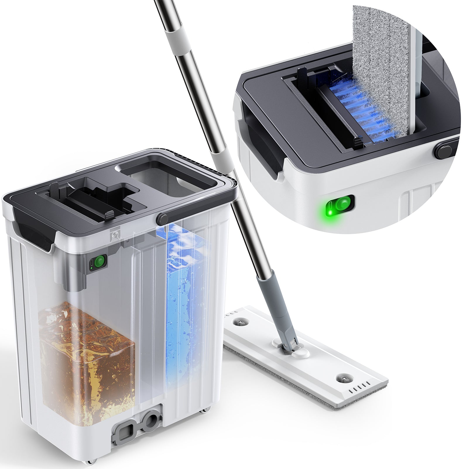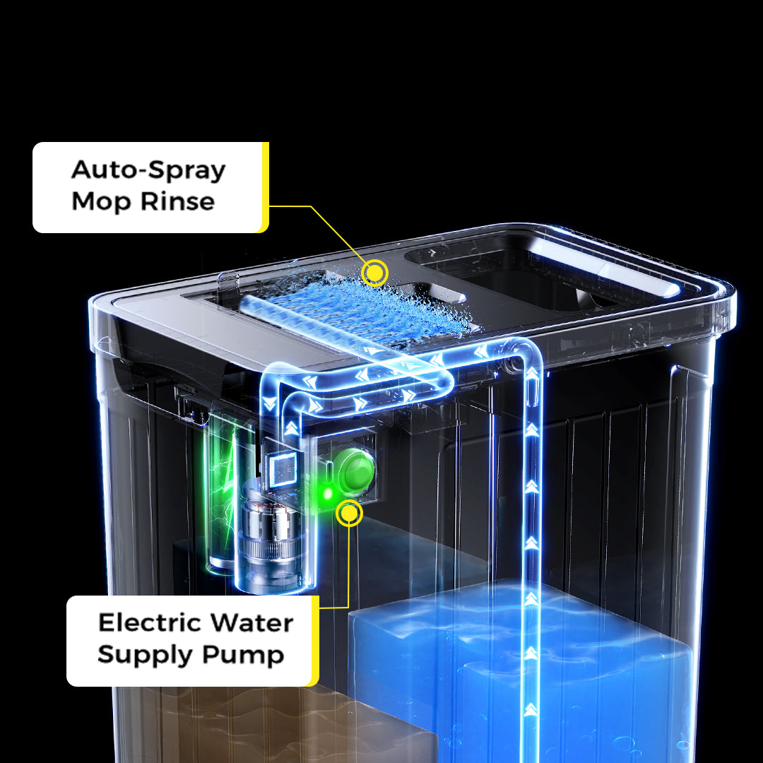 Instead of soaking a dirty mop repeatedly in dirty water, our electric pump sends clean water through the mop fibers at strong pressure—removing dirt rather than redistributing it.
