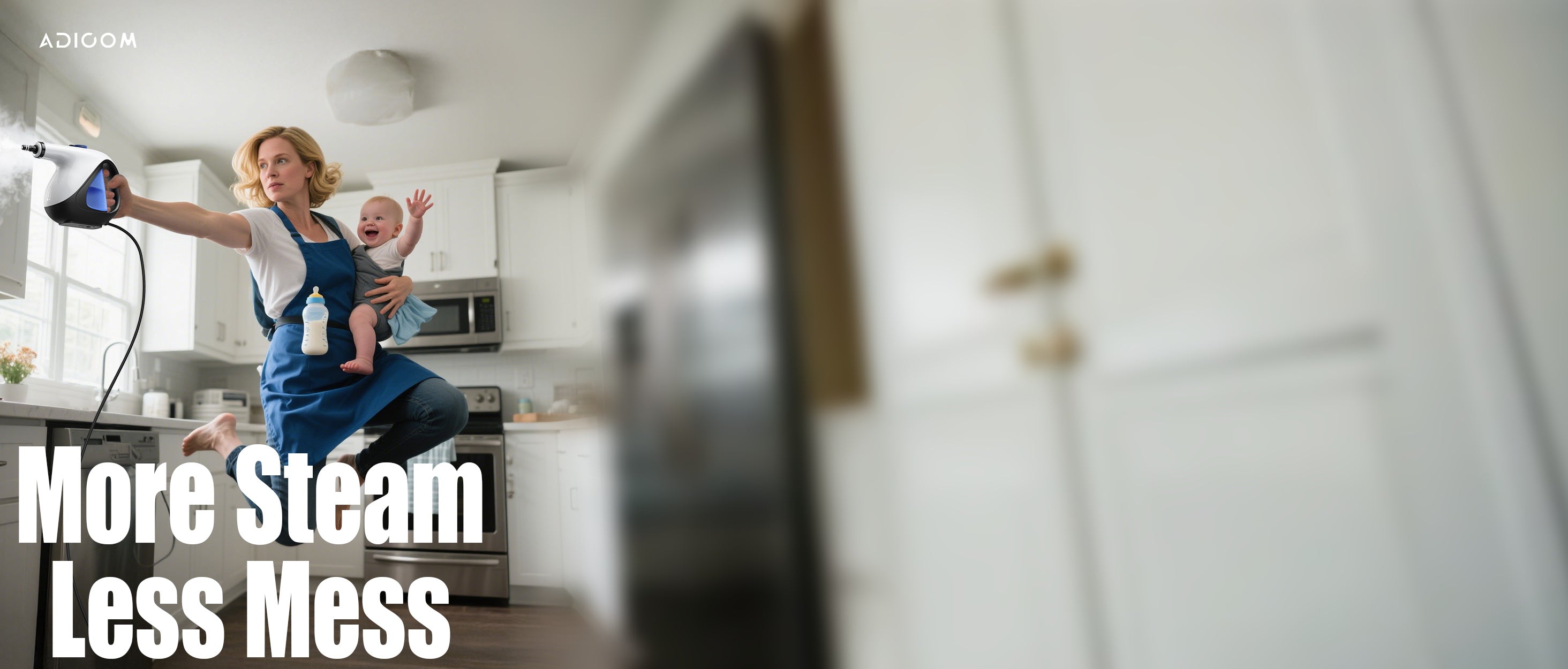 ADICOM heats in about 3 seconds, delivering constant, high-temperature steam for faster deep cleaning—especially useful in kitchens and bathrooms.